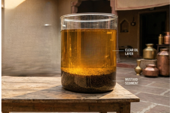 Oil is allowed to settle naturally so heavier particles slowly settle at the bottom. The clear oil is then collected carefully.